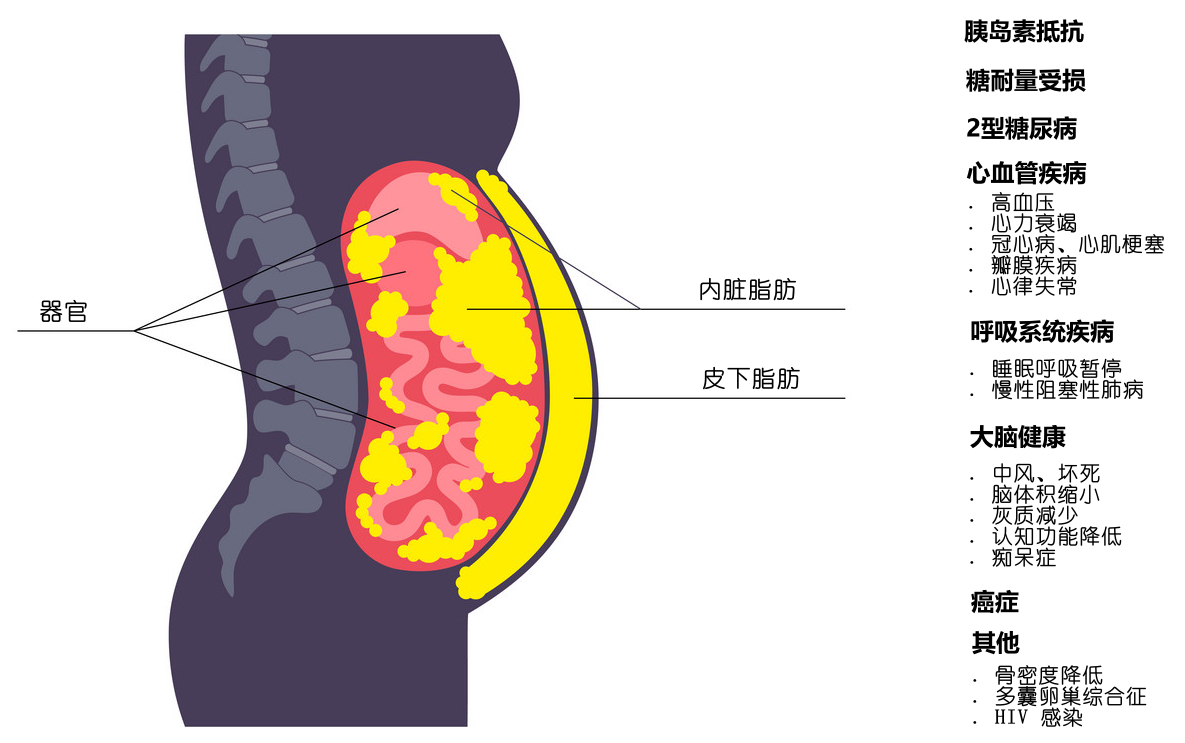 除此之外,內臟脂肪過多還與胰腺腫瘤、呼吸系統(tǒng)疾病、癌癥等多種慢性疾病相關。