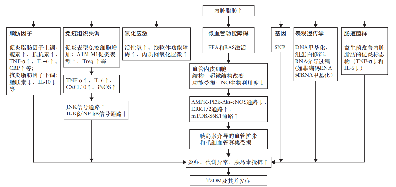 相比摸得到的皮下脂肪,內臟脂肪能夠產生較高水平的游離脂肪酸、脂肪因子和炎癥標志物,與外周胰島素敏感性下降和全身尤其肝臟胰島素抵抗密切相關,與T2DM發(fā)病緊密關聯(lián)。