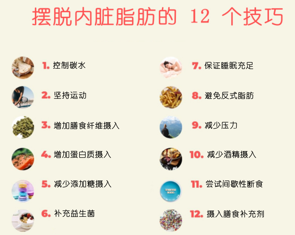 除上述方法外,減少添加糖的收入、增加蛋白質攝入、減少壓力、避免吸煙喝酒、同時保持良好的作息習慣、保證足夠的睡眠和休息等生活方式對內臟脂肪的減少都很有幫助。生活方式是基礎,也可搭配定期體檢來進行干預,了解自身體內激素水平,有針對性的進行治療,可大幅提升效率哦!