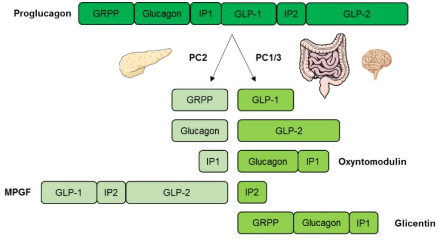 胰高血糖素(Glucagon)是一種主要由胰腺α細(xì)胞分泌、含有29個氨基酸的肽類激素,分子量約3.5kD,在血清中的濃度約為2~20pmol/L,主要在肝內(nèi)降解,部分在腎內(nèi)降解。胰高血糖素由胰高血糖素原(Proglucagon)衍生而來,后者可被加工成多種相關(guān)的肽類激素。胰高血糖素原在胰島α細(xì)胞、腸道內(nèi)分泌的L細(xì)胞中都有表達(dá),在腦干和下丘腦的神經(jīng)元中也有少量表達(dá)。胰高血糖素原分別由激素原轉(zhuǎn)化酶1/3(PC1/3)和激素原轉(zhuǎn)化酶2(PC2)處理。在胰腺中,PC2將胰高血糖素原加工成胰高血糖素,而在腸道和大腦中,胰高血糖素原由PC1加工,形成胰高血糖素樣肽1(GLP-1)和胰高血糖素樣肽2(GLP-2)。