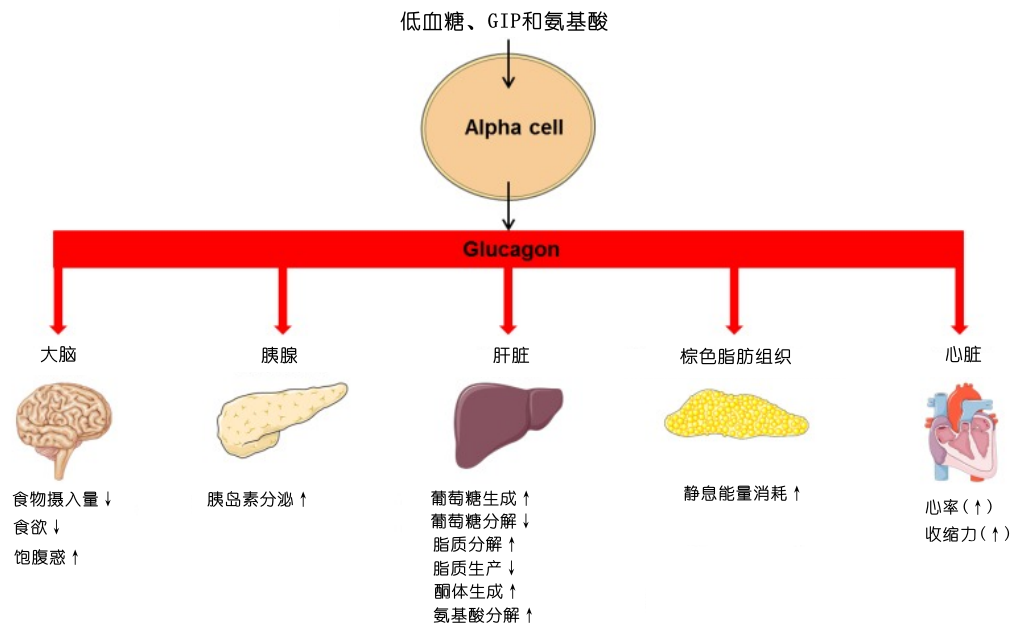胰高血糖素是一種葡萄糖調(diào)節(jié)激素,它通過刺激肝臟產(chǎn)生葡萄糖來抵消胰島素的作用,從而提高血糖水平。胰高血糖素能介導(dǎo)幾種非葡萄糖代謝作用,這些作用包括通過肝臟脂肪分解和酮體生成調(diào)動能量資源、刺激肝臟氨基酸代謝以及相關(guān)的尿素生成