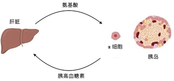 在長期禁食期間,胰高血糖素會通過上調(diào)參與氨基酸葡萄糖生成過程的酶,刺激該過程(通過葡萄糖生成)形成葡萄糖。胰高血糖素可促進(jìn)氨(脫氨基過程中產(chǎn)生的有毒副產(chǎn)物)轉(zhuǎn)化為尿素,并隨尿液排出體外。因此,胰高血糖素可降低血液中的氨含量。抑制胰高血糖素受體會破壞胰高血糖素的作用,導(dǎo)致血漿中氨基酸水平升高和胰腺α細(xì)胞增生,進(jìn)而導(dǎo)致胰高血糖素分泌過多。這表明,胰高血糖素和氨基酸在肝臟和胰腺α細(xì)胞之間的反饋回路中存在聯(lián)系。