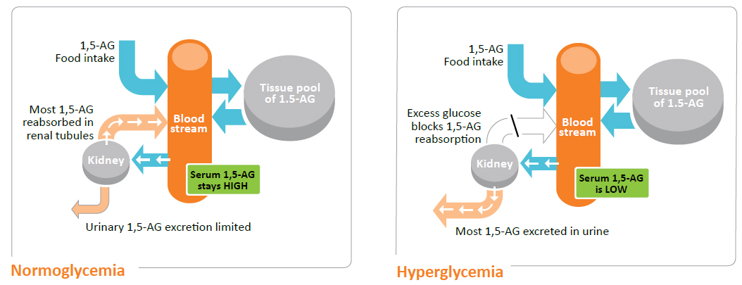 體內(nèi)1,5 - AG主要來源于食物,正常人每天平均從食物中獲得5 - 10mg,食入后通過小腸迅速吸收,吸收后經(jīng)過血液循環(huán)分布于各組織、臟器。從食物中攝入的1,5 - AG會(huì)從尿液中排出,攝入的1,5 - AG與尿排出的1,5 - AG形成了一個(gè)平衡,且其日吸收量與日排量成正比。在體內(nèi)1,5 - AG有一個(gè)龐大的代謝池,很少被降解或代謝,總含量維持在500 - 1000mg【3】 。因此血液中的1,5 - AG濃度不受進(jìn)食、忌食、肥胖、運(yùn)動(dòng)、應(yīng)激及服用各種藥物等多種因素的影響,非常穩(wěn)定。