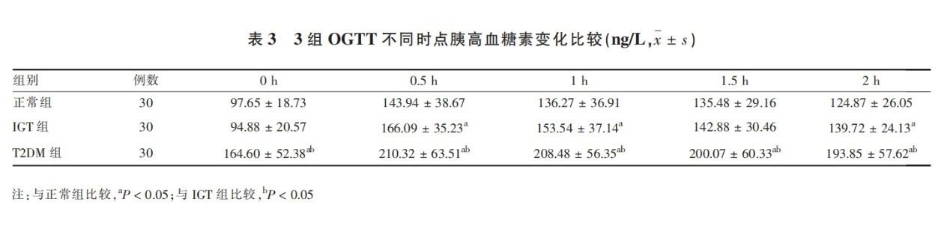 T2DM組在各時(shí)點(diǎn),IGT組在0.5h、1h、1.5h、2h的平均GLP-1低于正常組,T2DM組在0.5h、1h、1.5h、2h的平均GLP-1低于IGT組,組間差異有統(tǒng)計(jì)學(xué)意義(P<0.05)。
