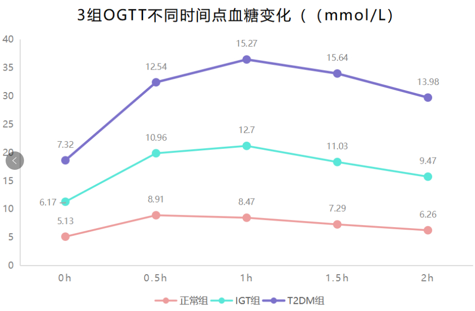 T2DM組在各時(shí)點(diǎn)平均血糖均高于正常組,在1h、1.5h和2h的平均血糖均高于IGT組,IGT組在0.5h、1h、1.5h和2h的平均血糖均高于正常組,差異均有統(tǒng)計(jì)學(xué)意義(P<0.05)。